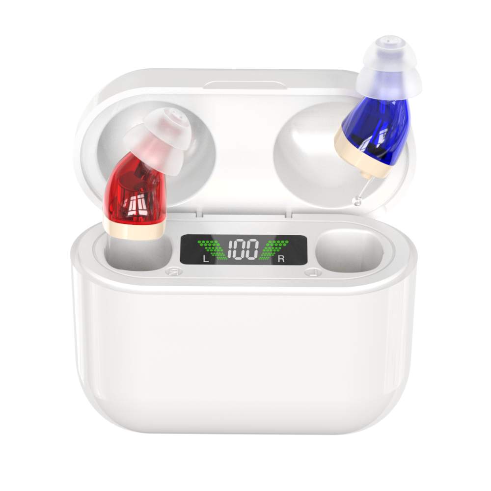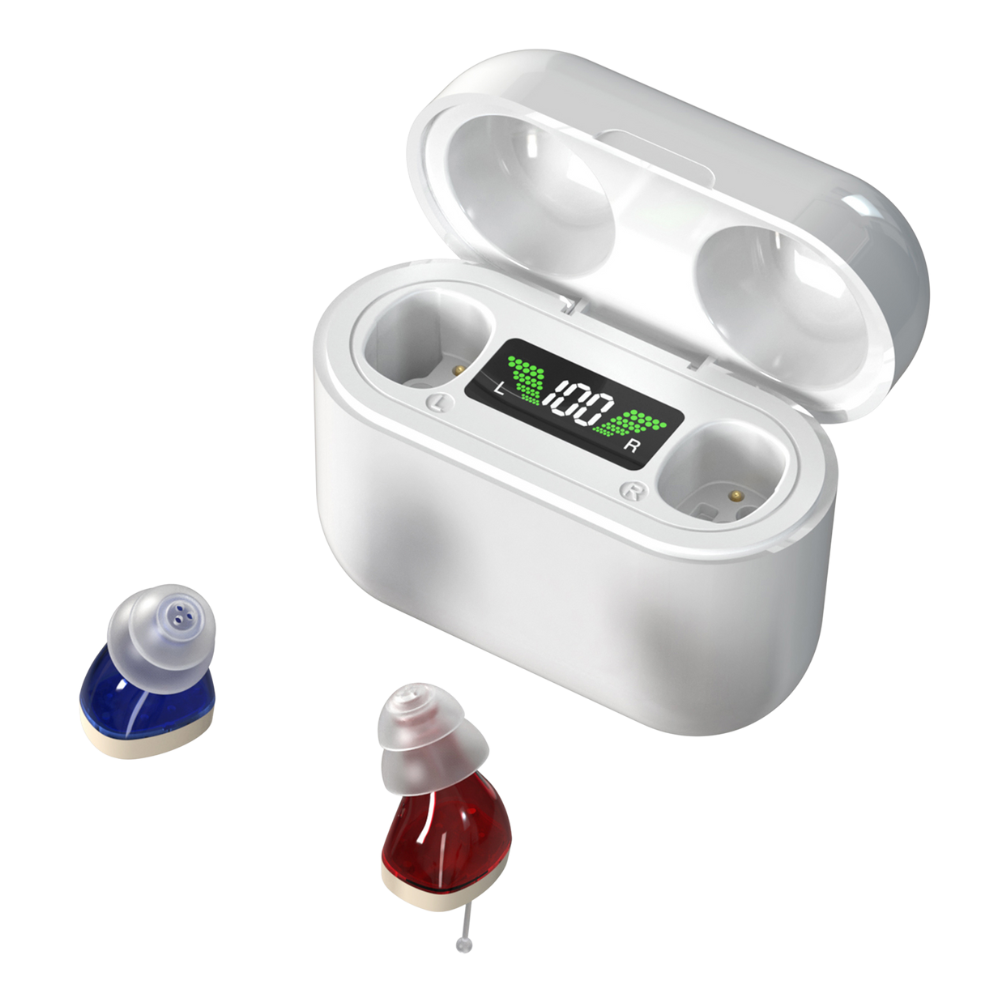 Unsere wiederaufladbaren Im Ohr KlarheitPro bieten einen kristallklaren Klang ohne Zischen oder Quietschen und reduzieren effektiv Windgeräusche. Sie sind von 10 dB bis 70 dB einstellbar, eignen sich für leichte bis schwere Hörverluste und verfügen über einen Drehknopf zur einfachen Einstellung.